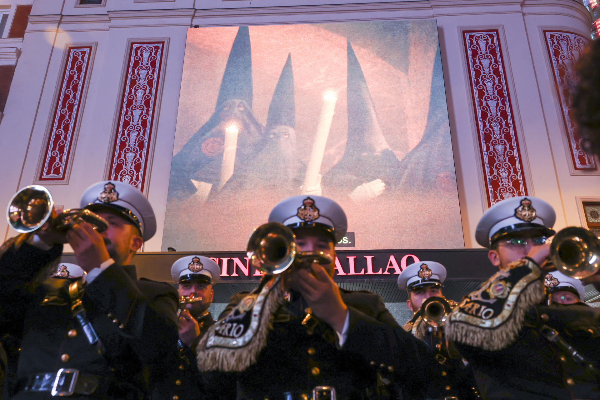Un total de 131 componentes de la banda del Rosario de Cádiz han desfilado hasta la Plaza del Callao, centro comercial y cultural de la capital, donde han interpretado la marcha mientras se proyectaban las imágenes de la campaña en la pantalla principal de los cines allí ubicados.
