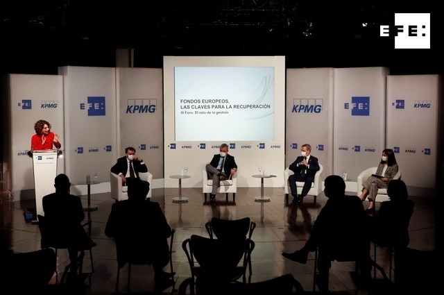 La ministra de Hacienda, María Jesús Montero, ha clausurado este jueves la jornada, organizada por EFE y la consultora KPMG sobre los fondos europeos, centrada en el reto que supone la gestión de los 140.000 millones de euros en los próximos seis años.