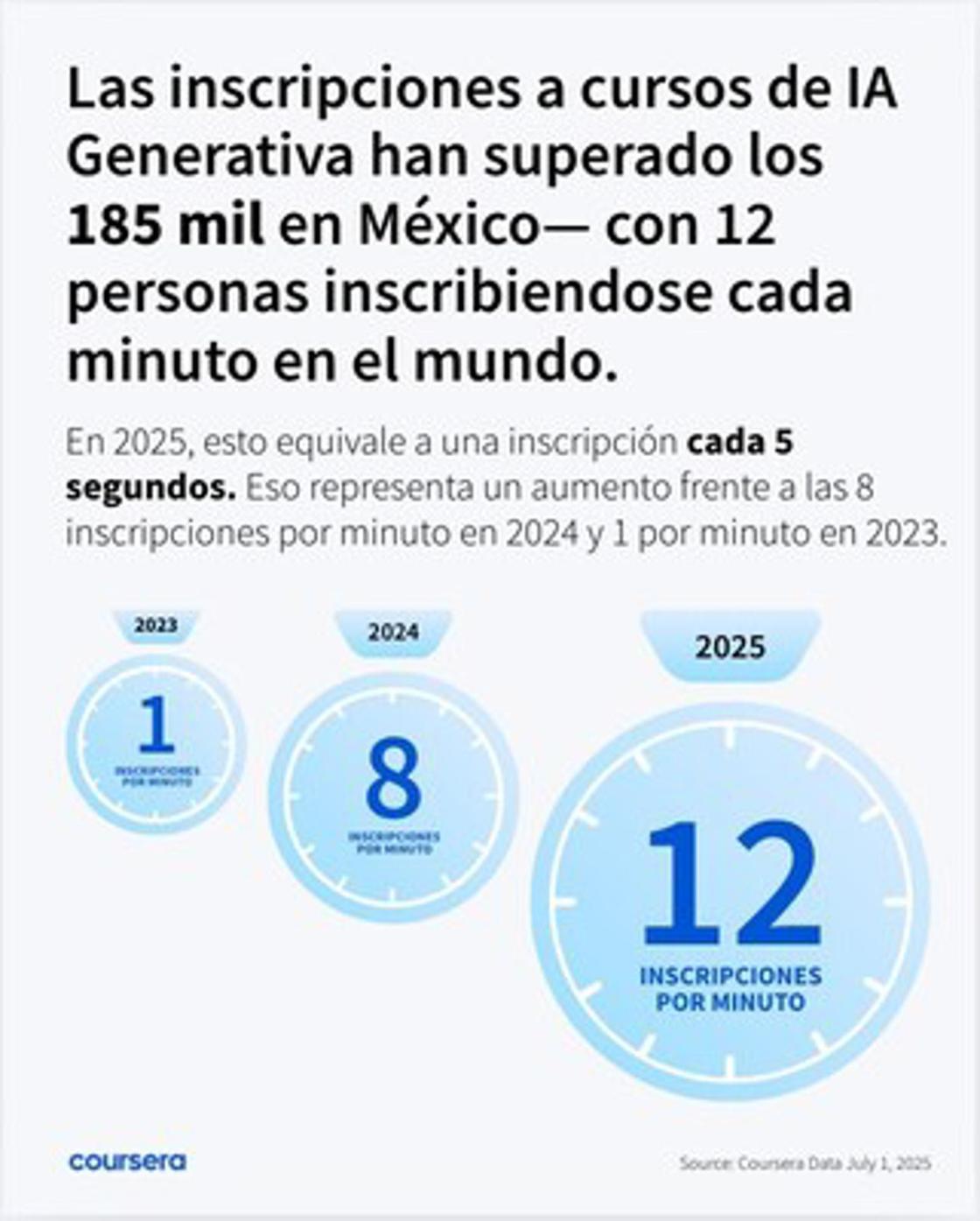 México experimenta una de las tasas más rápidas de evolución de habilidades. Las inscripciones a GenAI en Coursera han superado las 185,000, lo que refleja la creciente demanda de habilidades en IA en el país. En 2025, los estudiantes contribuyeron a una tasa global de 12 nuevas inscripciones por minuto.