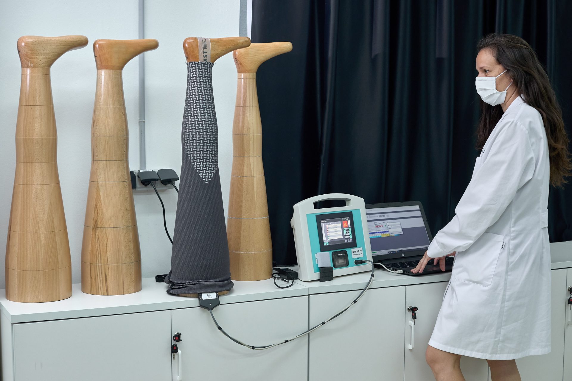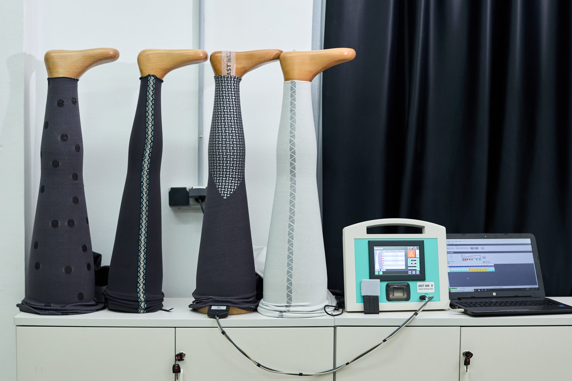 ALCOI (ALICANTE), 05/07/2021.- El Instituto Tecnológico del Textil ha desarrollado el proyecto TPTEX 2.0 mediante el que producen unas prendas compresivas para el tratamiento de enfermedades como el linfedema o el lipedema cuya principal novedad es que son de uso exterior, como leggings normales. En la imagen diversos moldes de pierna de madera de diferentes grosores en los que se realizan comprobaciones de presión. FOTO: EFE/ Natxo Francés