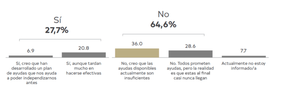 En este contexto, el 65% considera insuficientes las ayudas públicas existentes para facilitar su emancipación y tres de cada 10 afirman que, aunque prometidas, dichas ayudas rara vez llegan a materializarse.