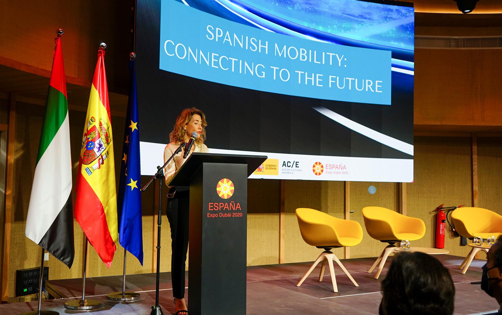 La ministra española de Transportes, Movilidad y Agenda Urbana (Mitma), Raquel Sánchez, presentó en la Expo de Dubái el congreso Global Mobility Call (GMC), que se celebrará en Madrid en junio y que, aseguró, pretende liderar la transición hacia «un modelo de transporte más sostenible, conectado y seguro».