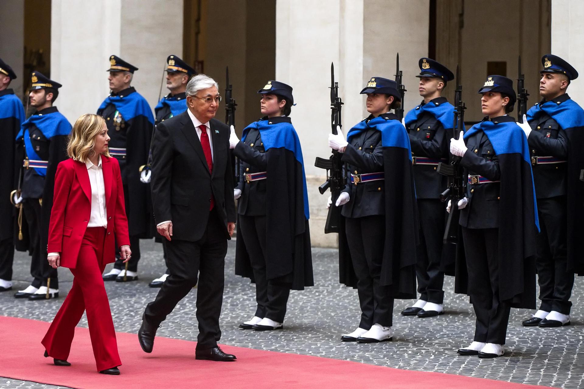 Posteriormente, el mandatario kazajo se reunió con la primera ministra italiana, Giorgia Meloni, que le recibió, como manda el protocolo, con un piquete de honor en el Palacio Chigi de Roma, sede del Gobierno.