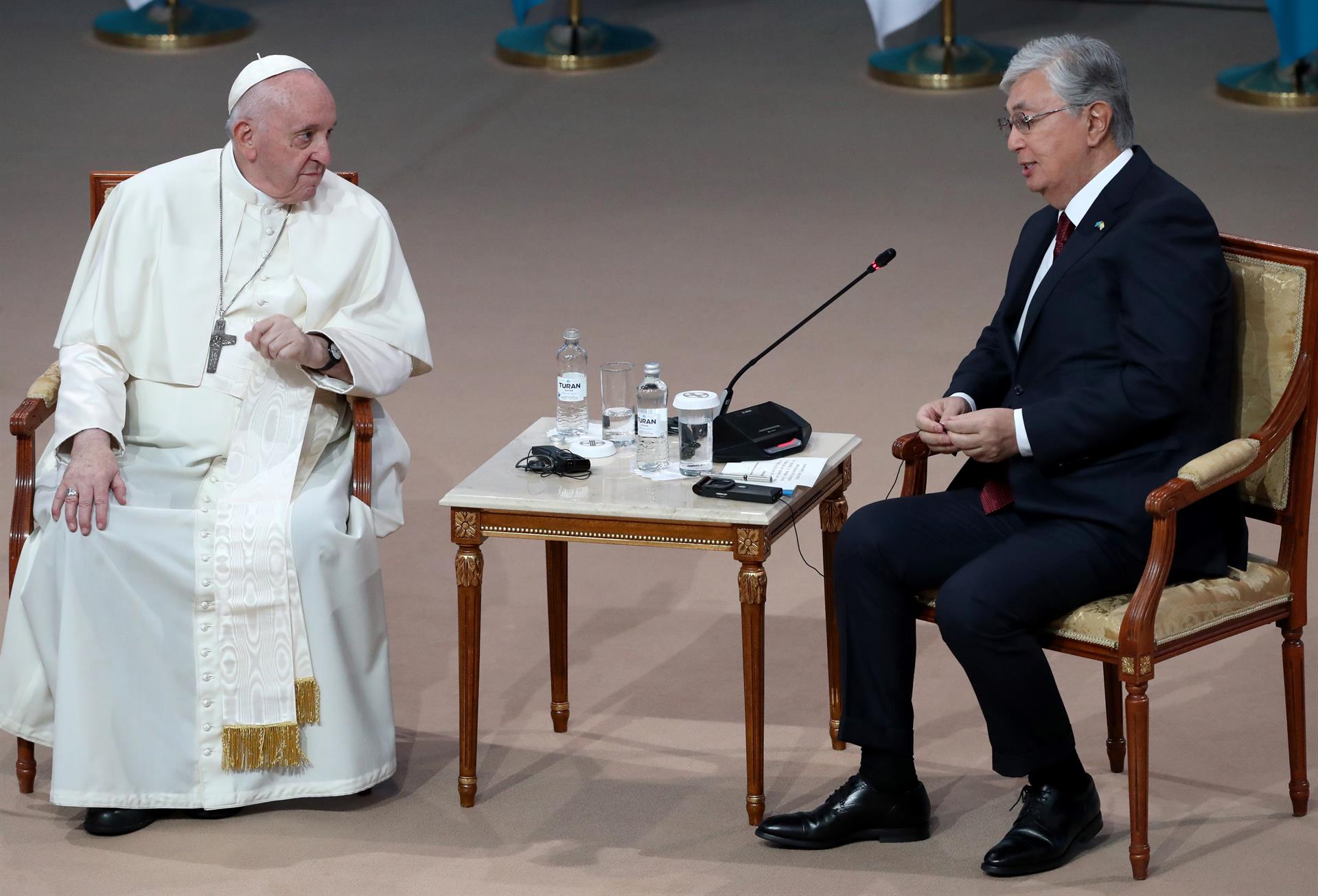 Nur-sultan (Kazakhstan), 13/09/2022.- Pope Francis and President of Kazakhstan Kassym-Jomart Tokayev attend a meeting with government officials, the diplomatic corps and civil society in Nur-Sultan, Kazakhstan, 13 September 2022. Pope Francis will visit the Capital of Kazakhstan from 13 to 15 September. EFE/EPA/IGOR KOVALENKO