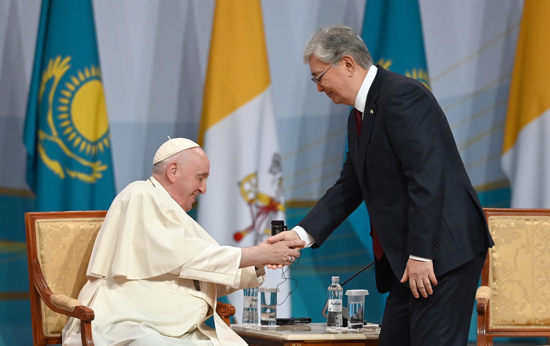 Nur-sultan (Kazakhstan), 13/09/2022.- A handout picture made available by Kazakhstan President press-service shows Pope Francis (L) shakes hands with Kazakh President Kassym-Jomart Tokayev (R) during a meeting with the authorities, civil society and the diplomatic corps at the ÔQazaq Concert HallÕ in Nur-Sultan, Kazakhstan, 13 September 2022. The Pope is planned to meet with President Tokayev and hold a meeting with participants in the VII Congress of Leaders of World and Traditional Religions. (Papa, Kazajstán) EFE/EPA/KAZAKHSTAN PRESIDENT PRESS SERVICE/HANDOUT HANDOUT HANDOUT EDITORIAL USE ONLY/NO SALES