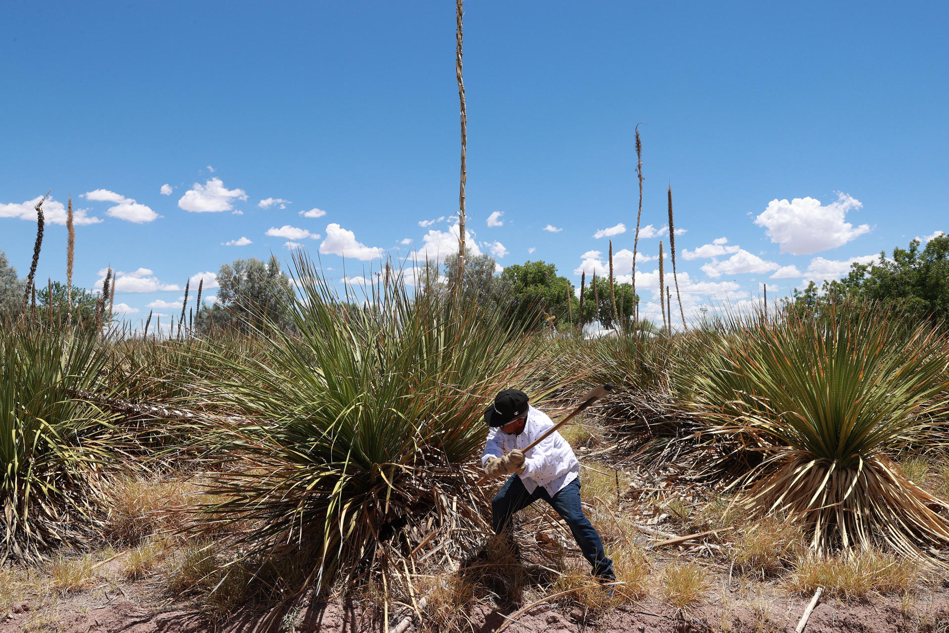 The “jimador,” a specialized farm worker who harvests sotol plants, shows the core that will be cooked and later distilled into sotol. Access is complicated, as it only grows in the wild on the steep slopes of the extreme deserts of northern Mexico. There, temperatures are scorching during the day and freezing at night.