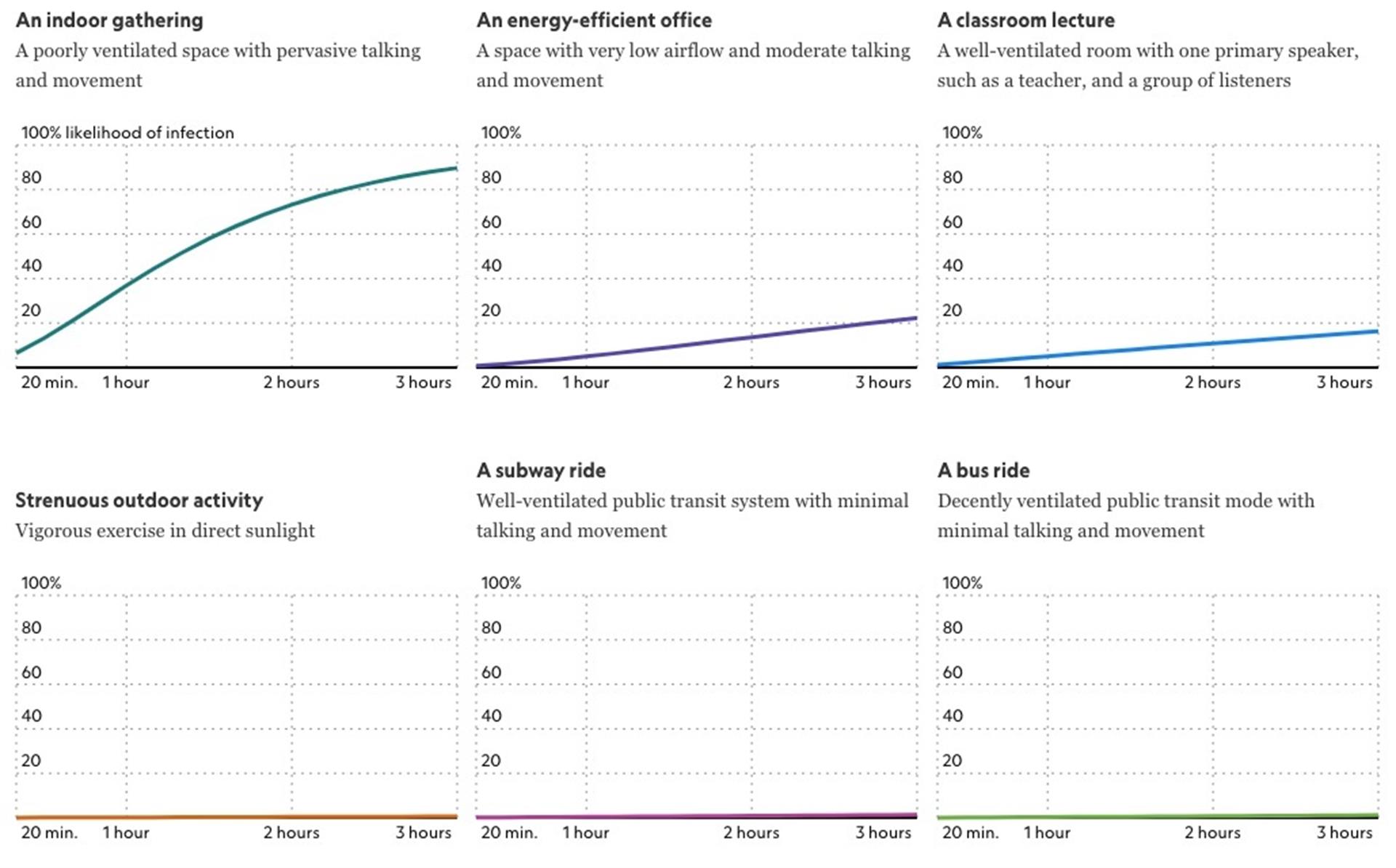 Un ejercicio modelo llevado a cabo por investigadores de la Universidad de Colorado (Estados Unidos) estima que la posibilidad de contagiarse de COVID-19 en un trayecto de tres horas en autobús o metro bien ventilado y siguiendo las medidas sanitarias como evitar hablar, comer, beber o moverse a bordo es de sólo un 1%. En cambio, una clase de tres horas con una única persona hablando en un aula bien ventilada supone un riesgo del 16%, según este mismo modelo.