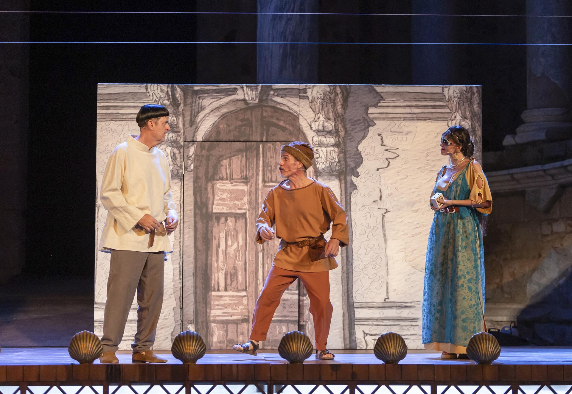 Personajes que entran y salen de escena, enredos, ovillos de dimes y diretes, y golpes de humor, algunos no muy sofisticados, sostienen este «Miles Gloriosus», que en su primer día de representación en el Festival Internacional de Teatro Clásico de Mérida ha llenado las caveas de este templo de la escena.