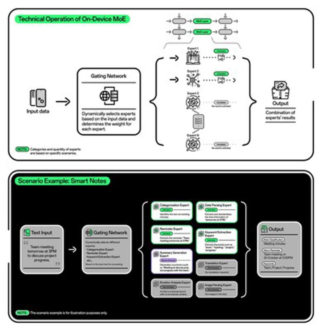 La arquitectura MoE activa dinámicamente submodelos especializados («expertos») para realizar tareas específicas, mejorando considerablemente el proceso y reduciendo el consumo informático y de transferencia de datos. Las pruebas de laboratorio revelan que la arquitectura MoE en los dispositivos, aceleran la velocidad de las tareas de IA en aproximadamente un 40%, disminuyendo la demanda de recursos y mejorando la eficiencia energética. Esto significa respuestas más rápidas de IA, mayor duración de la batería y más privacidad, ya que se pueden gestionar más tareas en el dispositivo.