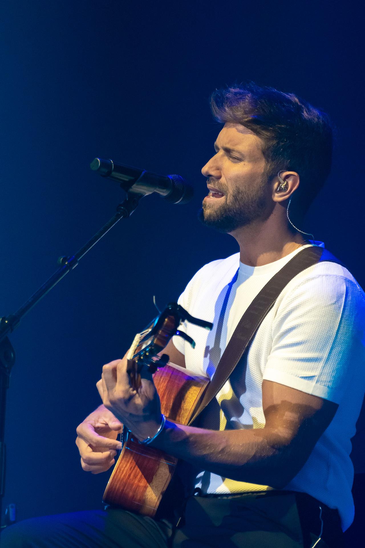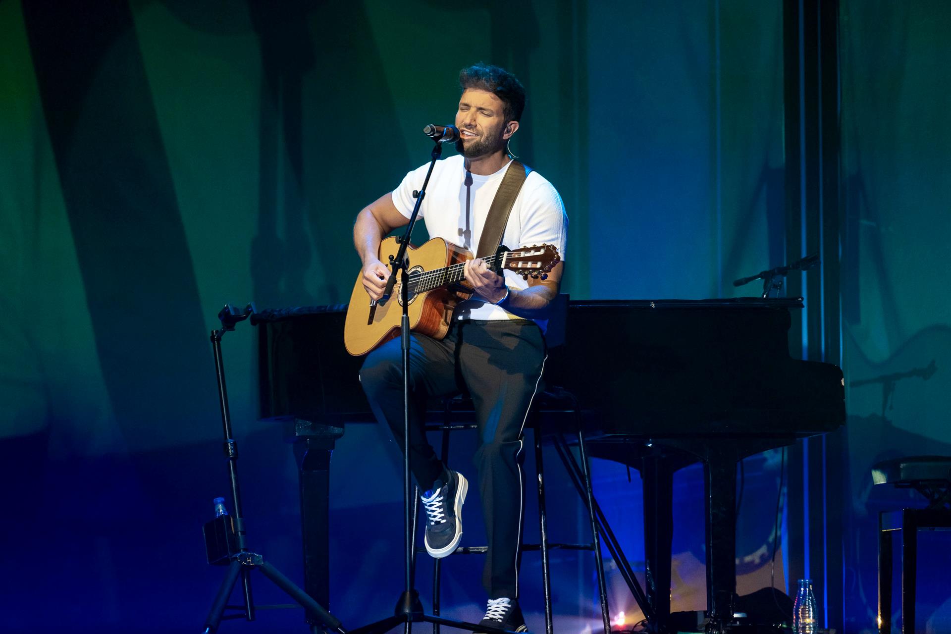 Con todas las entradas agotadas, el cantante malagueño ha salido al escenario para ofrecer un inicio de concierto íntimo y acústico: él solo con la guitarra ha interpretado “Hablemos de amor” y “Desencuentros”.